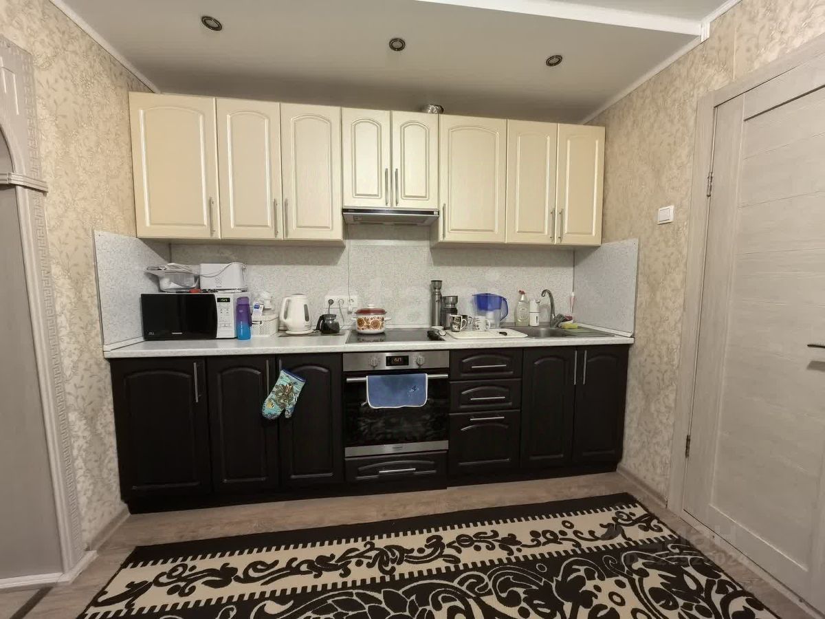 В квартире остаётся качественный кухонный гарнитур с встроенной техникой и стиральной машинкой, а также стенка в гостиной.
