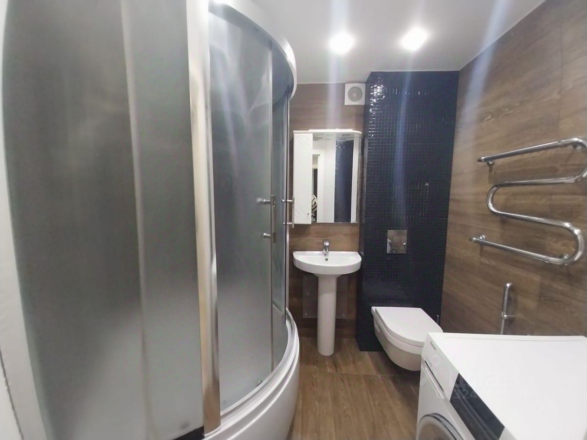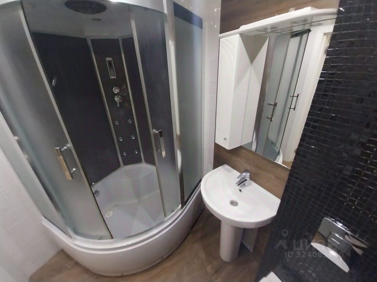 Совмещённый санузел с душевой кабиной отделан мозаикой и плиткой.
